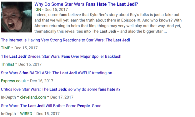 Yes, and there’s a ton of those people and they’re the same kind of people who hated Last Jedi. Not enough to actually not buy a ticket, and the home version, and every upcoming entry in the series, but enough that they’re furiously typing negative online reviews left and right. The more run of the mill moviegoer weren’t the ones going home and punching their pillow because Luke Skywalker didn’t turn out to be Rey’s dad and of course they were in the majority, yet we all still heard how upset “everyone” was about it.