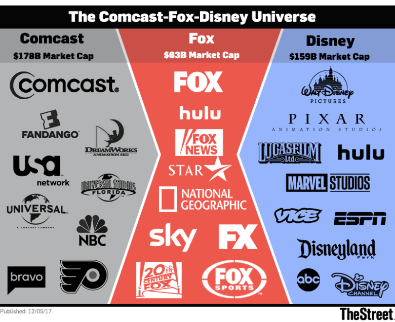 Comcast and AT&T are cable companies looking to own the companies which make much of the content they offer in their cable packages; Disney is a theme park/film/TV entertainment conglomerate looking to buy out a direct competitor as a way boost film and TV production and add to its theme park options. In the current legal environment, the former poses a more immediate antitrust concern than the latter. Fox picked the path of least resistance.
