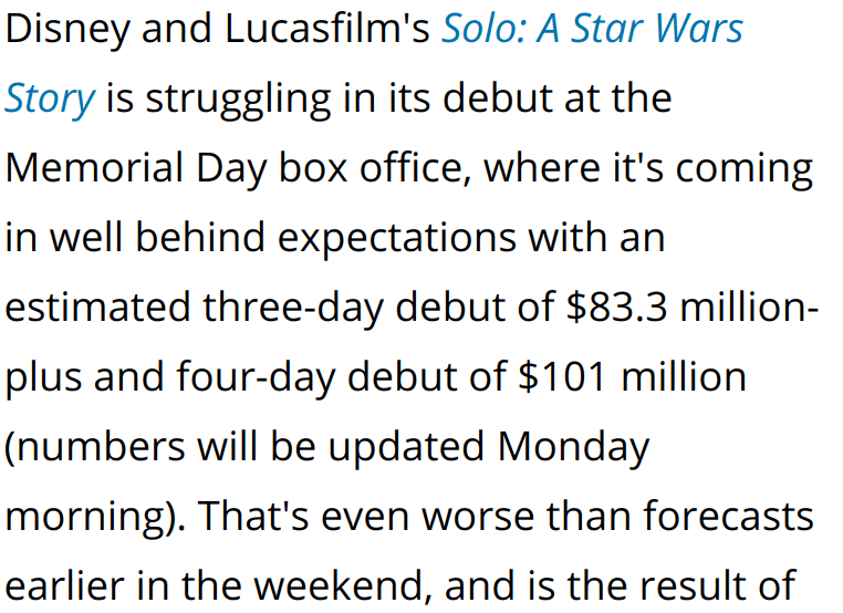 -Because Solo was supposed to make $150 million, according to pre-release tracking.