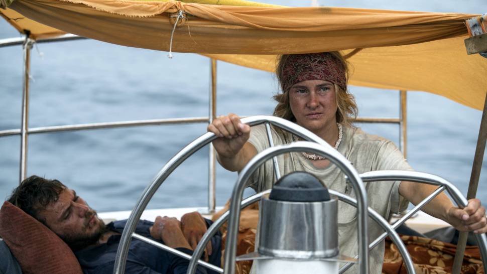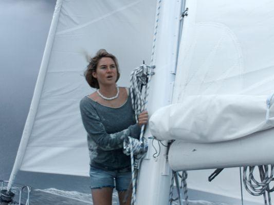 That’s the feel-good hook of Shailene Woodley’s new survival thriller Adrift, a loose adaptation of Tami Oldham’s book detailing her ordeal at sea back in 1983. I say “feel good” because although this story drops Woodley’s version of Oldham into some of the direst straits imaginable it is, at its heart, a love story. Woodley’s I’ll-ride-life’s-wave-where-it-takes-me Oldham ends up in Tahiti, where she meets and falls in love with Richard (Sam Claflin), a kindred soul seeking to conquer the horizon. Their adventures together eventually put them right in the path of a quickly-developing category 4 hurricane, leaving them adrift and Richard with cracked ribs and a broken leg.