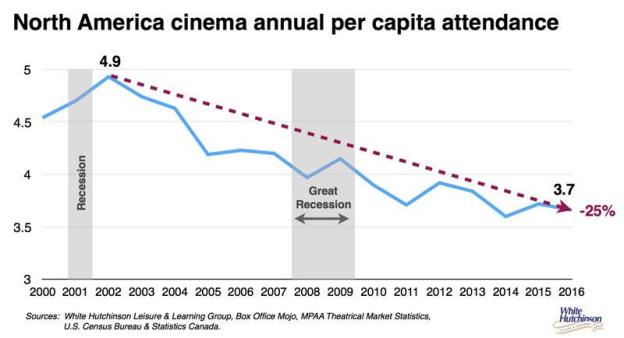But, people love a good deal, and they don’t get any better than MoviePass’ enticing prospect of being able to see a movie a day for just $10 a month. Lowe, the video store owner turned Netflix and Redbox co-founder, recognized an inefficiency in the market. Faced with declining attendance, movie theaters thought the answer was to raise prices in exchange for a more premium experience with better seats, more varied menus, and state of the art screens and sound systems. The higher prices and thus bigger box office totals masked the unmistakable reality: attendance is still going the wrong direction.