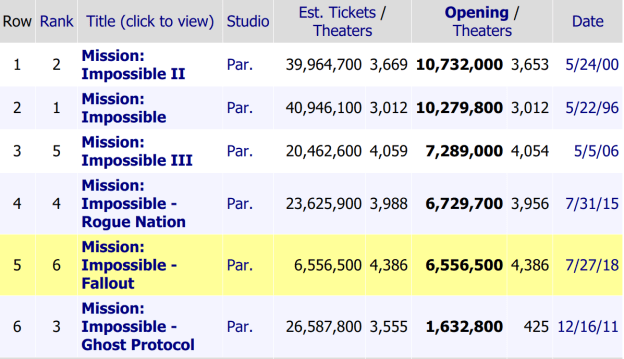 But there is a downside here. It’s mostly of the annoying, but true “you have to adjust for inflation!” variety, but here it is: Fallout didn’t actually grow the Mission: Impossible audience. In fact, by BoxOfficeMojo’s estimate it sold fewer tickets than Rogue Nation domestically.