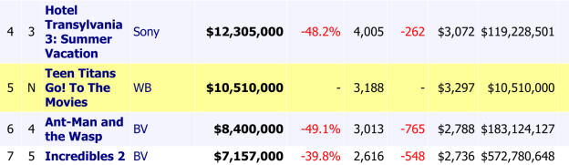 Given the current state of the animated market, if WB was serious about making a big box office run they would have surely moved Teen Titans away from Hotel Transylvania. They didn’t, signaling they are likely okay with this performing like “one for the fans” that then keeps them funnelling money into toys and video games. A $10m debut is still lower than expected, but it’s not a killer.