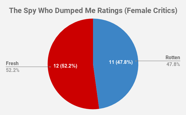 However, women have indeed been slightly more receptive to this film’s charms. Only 33% of male critics have either directly graded or had RottenTomatoes grade The Spy Who Dumped Me for them as Fresh; compare that to the 52% of female critics who think the film deserves a Fresh rating.