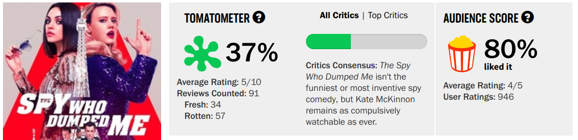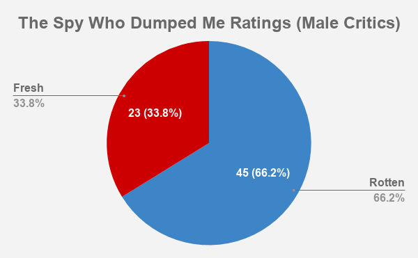 However, women have indeed been slightly more receptive to this film’s charms. Only 33% of male critics have either directly graded or had RottenTomatoes grade The Spy Who Dumped Me for them as Fresh; compare that to the 52% of female critics who think the film deserves a Fresh rating.