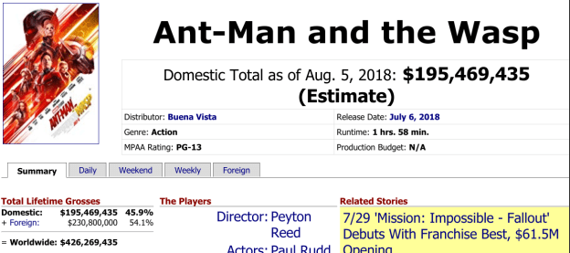 The updated total numbers, as of 8/5. Keep in mind that Ant-Man cost $130m to make while Ant-Man and the Wasp, after tax-credits, reportedly had a budget in the $162m territory: