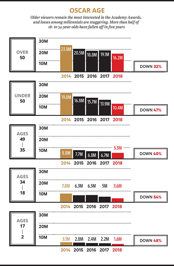 The ratings were actually down 4% from 2017, low enough to rank it as the least-watched Oscars telecast since 2008. Digging even deeper, the 18-to-34-year-old demographic has fallen off by 54% in just the last five years.