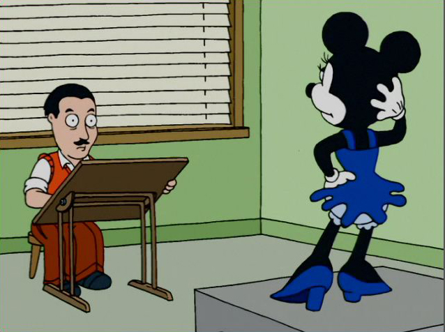 Family Guy’s version of Walt drawing Minnie for the first time. “Now take it off” is the eventual punchline.