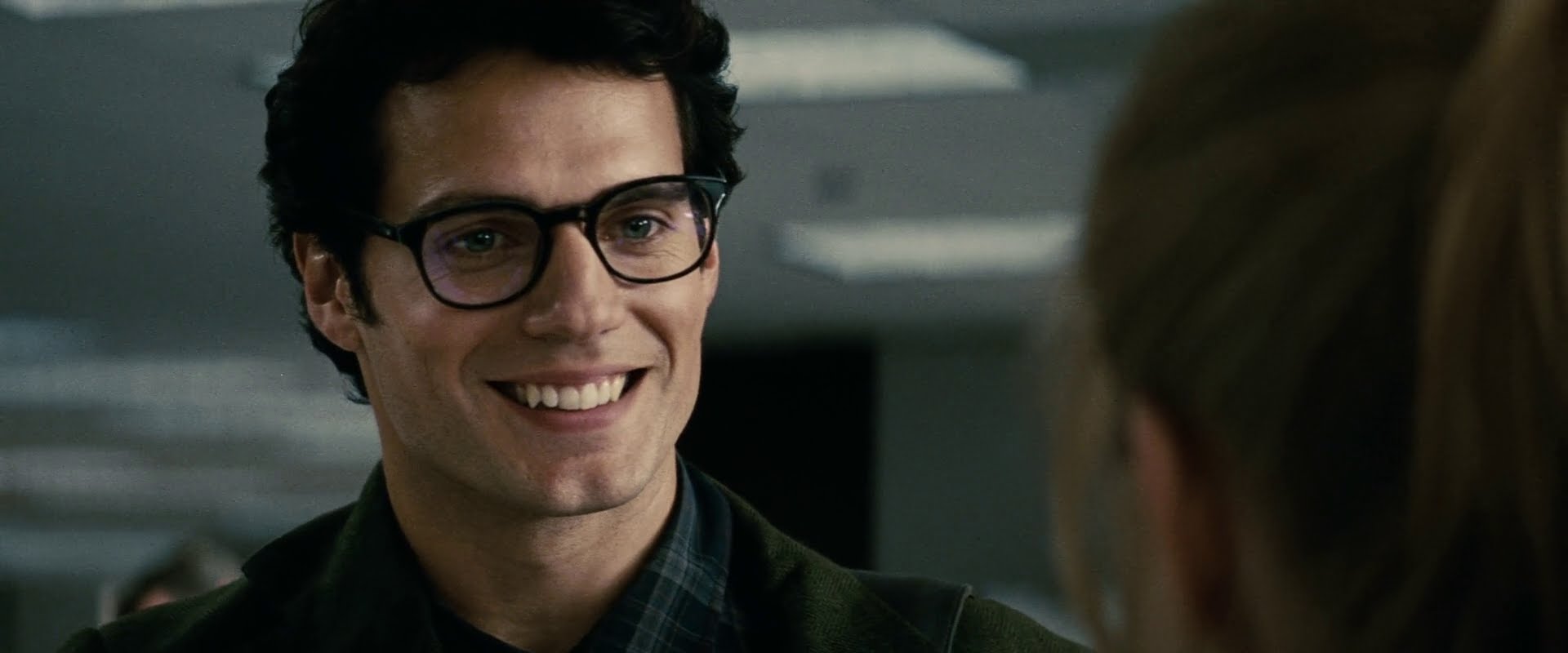 Cavill’s Kal-El, newly battle-tested and determined after his rock ’em, sock ’em Kryptonians fight with Zod, enters the Daily Planet wearing his signature Clark Kent glasses.