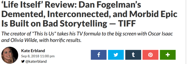 Before long, Life Itself will be out of theaters and available to stream on Amazon Prime. Only then will it likely find an audience. Until then, well, This Is Us’ new season premieres tonight. Back to the day job, Fogelman.
