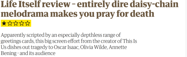 In fact, this is, oddly, a Will Smith specialty. Except the difference is Will Smith’s name alone can turn a movie like this into if not an outright hit then at least something which breaks even at the worldwide box office. Life Itself, on the other, is dead in the water, particularly with actual awards contenders like First Man and A Star is Born a week or two away.