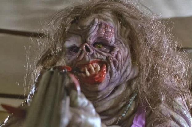Now, House II: The Second Story, that works. A sequel in name only, it’s an action-adventure western comedy where the titular house isn’t so much traditionally haunted as it is a gateway to different dimensions. Our hapless heroes (Arye Gross and Jonathan Stark) wander into prehistoric times and come back with a pet pterodactyl and catapup (caterpillar-crossed with a dog, especially a pug) and later save an Aztec princess from being sacrificed. There’s a cowboy zombie nicknamed “Gramps” hiding out in the basement. He’s being hunted down by a cowboy zombie nicknamed “Slim.” They’re each after a crystal skull with jewels in the eyes. Lar Park Lincoln and Amy Yasbeck are also around as the 80s girlfriends, one all business, the other all party. Kane Hodder shows up in a gorilla suit.