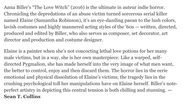 That’s what director/writer/producer/composer/editor/painter/set and costume designer Anna Biller told The Guardian about her peculiar 2016 indie. Since debuting at the International Film Festival Rotterdam and subsequently making its way through the festival circuit, The Love Witch has been crowned a new cult classic. It ended up ranking high on many notable Best of 2016 lists. Earlier this year, RottenTomatoes argued it’s one of the top 40 horror movies of all time. Just two days ago, The New York Times’ Sean T. Collins penned a lovely tribute to the film for the publication’s “Watching” newsletter: