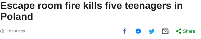 As far as the accident in Poland goes, that is a great question. The latest I’ve read is that police are charging the 28-year-old grandson of the business owner with “”deliberately creating the danger of a fire in the escape room and with unintentionally causing the death of people in a fire.”