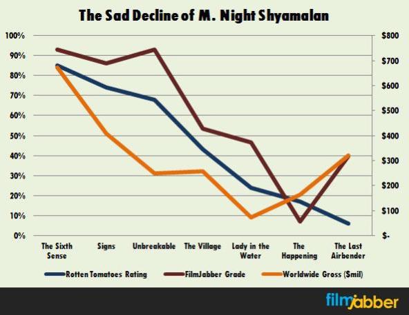 I think people should have been more cynical of him staying in form. Statistically, his career highlight was “The Sixth Sense” and even that only has a metacritic rating of 64% and he’s produced twice as many duds as slightly good films.
