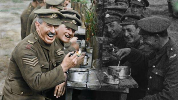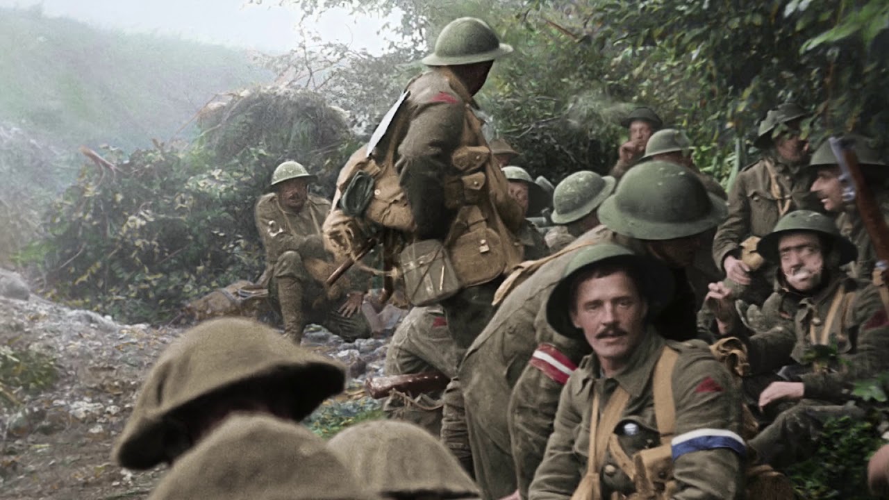 The black & white imagery on screen, originally presented in a boxed format and purposefully playing as if we can hear the old projector spinning the film reels, gradually expands to full screen. Suddenly, without warning, it all switches to vibrant color and sound, like a history book magically waving back at you. British soldiers, young and old, are given color, voice, and natural movement, something they’ve never had before since when they were alive film was black & white, silent, and shot at 13-15 frames a second.