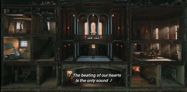 The characters are back together in the house again for the first time in over a decade, but rivalries have been quickly renewed and they’ve all retreated to their old rooms. Luther – once their de facto leader, now a towering mass of a man who can’t get any respect – plays an old Vinyl record of Tiffany’s “I Think We’re Alone Now,” an obviously on-the-nose selection, loud enough for the whole house to hear. One by one, the siblings dance in ways which reveal more about their character than their words have. Slowly, the camera pulls out for this diorama-shot: