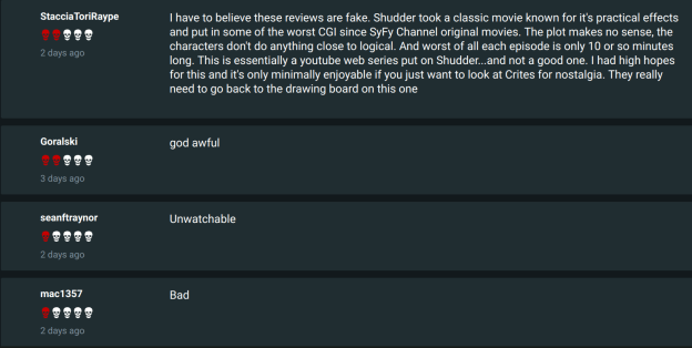 There’s plenty of reason for longtime fans to cling to that last part because New Binge ultimately feels less like a fresh new start and more like a Critters parody. Some of the Shudder user reviews have been especially unkind: