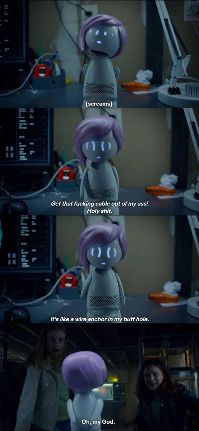 To some, the moment the episode stops being about the sisters and more about Ashley’s mad dash to beat her aunt is the moment it stops seeming like Black Mirror. How can it be? It’s so funny! When the Ashley Too malfunctions and is able to access all of the real Ashley’s personality instead of just a censored 5% of it, she turns into a foul-mouthed Miley Cyris bitching about fans never keeping their end of the bargain. It’s hard not to laugh at just about every single one of her lines.