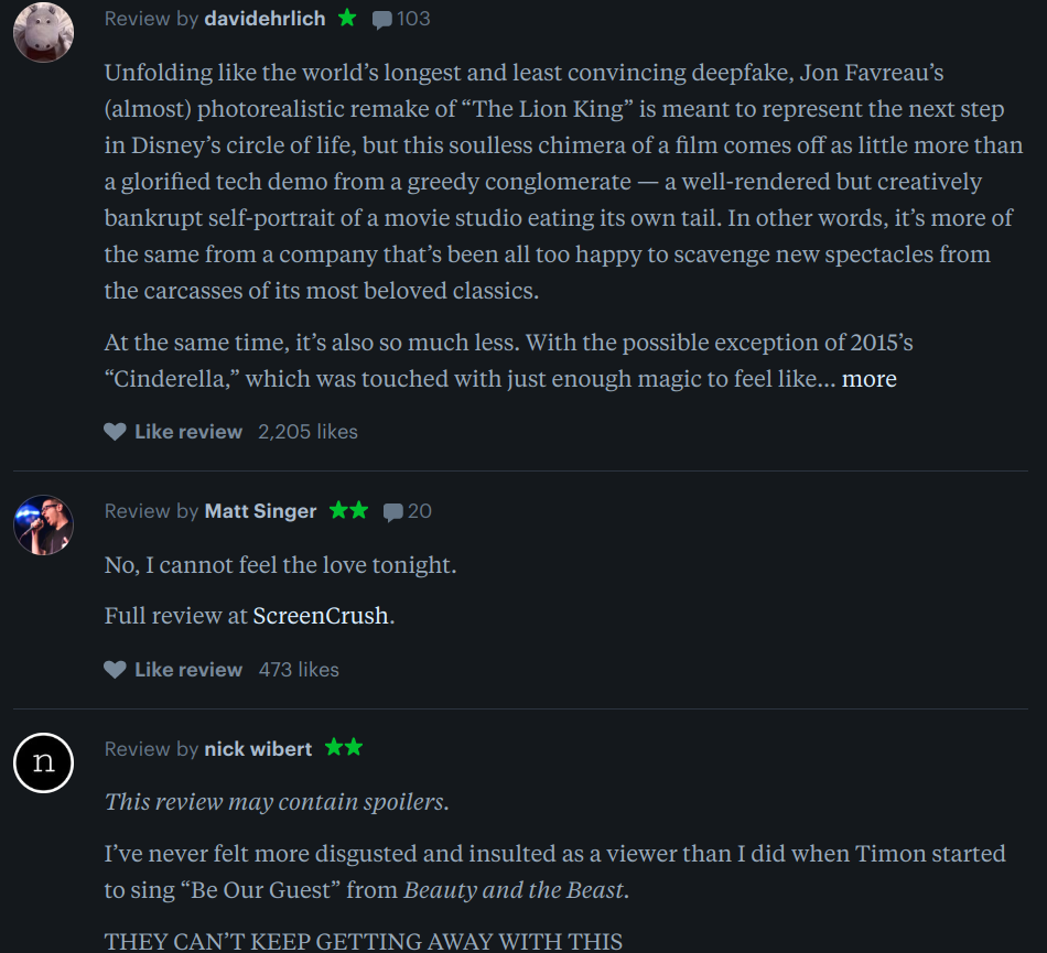 Not all of that talk has been positive, of course. A couple of weeks ago, the early word on Twitter after the first Lion King press screenings was not only not good but often quite hostile, with many throwing around phrases like “creatively bankrupt” and “symbolizes everything that’s wrong with Hollywood.” I hadn’t seen a group of cinephiles so enraged in response to a remake since maybe Gus Van Sant’s shot-for-shot update of Psycho.