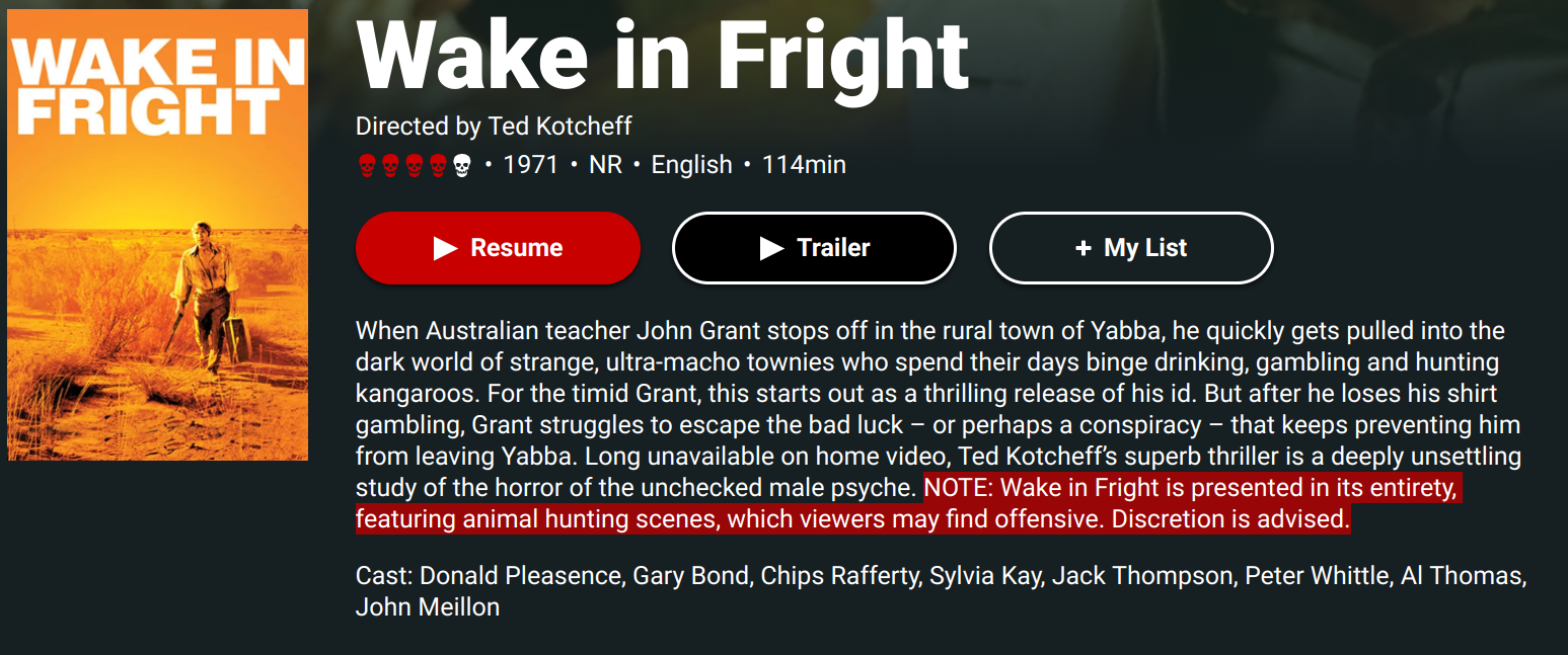 At the ‘09 screening, 12 people walked out during the sequence where live kangaroos are killed on screen, like an Aussie version of Cannibal Holocaust’s infamous sea turtle dismemberment scene. When Shudder recently added Wake in Fright to its “Borderlands Horror” collection, whoever is responsible for the little blurbs about each movie made sure to include the following disclaimer: