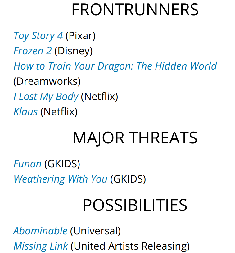 So, yeah, I don’t exactly feel totally secure that both Klaus and I Lost My Body can hold off Weathering With You. It was just last year that the Academy – which hasn’t always responded to anime films – nominated Mirai, an anime that won the Annie for Best Independent Feature. Since the category’s creation in 2015, every Best Independent Feature winner has gone on to an Oscar nomination.