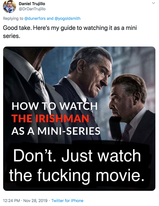 There were, it should be noted, many who merely offered up funny Irishman memes and gifs and moved on. Many more found the cultural noise and extreme runtime too confusing/intimidating and bowed out. However, for the purists, those who genuinely criticized The Irishman’s length or female representation crossed a line.
