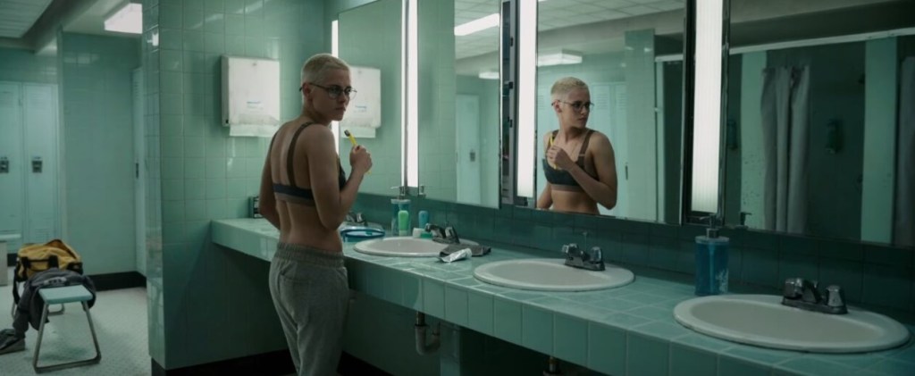 Within the film’s first couple of minutes, it is immediately obvious that Eubank wasn’t kidding when he claimed to owe a lot to survival video games. Kristen Stewart’s buzzcut-loving Norah gets all of maybe three-minutes to brush her teeth and voice-over to us about the virtues of cynicism before she is thrust in what would play like an absolutely killer opening cut-scene in a video game.