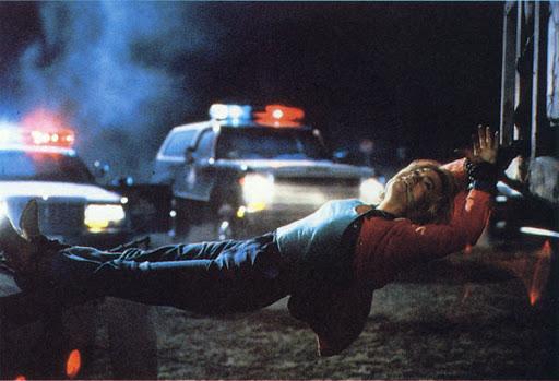 Actually, to the film’s credit, romance doesn’t exactly bloom between the two. She simply takes pity on him because he has a trustworthy face, but minutes after their first meeting he’s captured by the cops and hauled away, wrongly accused of The Hitcher’s killing spree. They don’t meet again until much later in the movie, at the end of her day and on her bus drive home where he attempts to take her hostage.