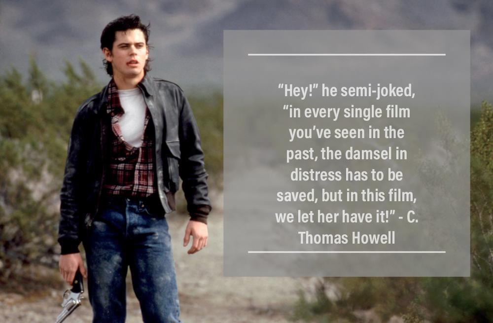 In 2003’s direct-to-video effort The Hitcher II: I’ve Been Waiting, C. Thomas Howell reprises his role as Jim Halsey, but – spoiler – he takes an early exit from the story, killed off so that the new Hitcher played by Jake Busey can further terrorize Halsey’s girlfriend played by Kari Wuhrer.