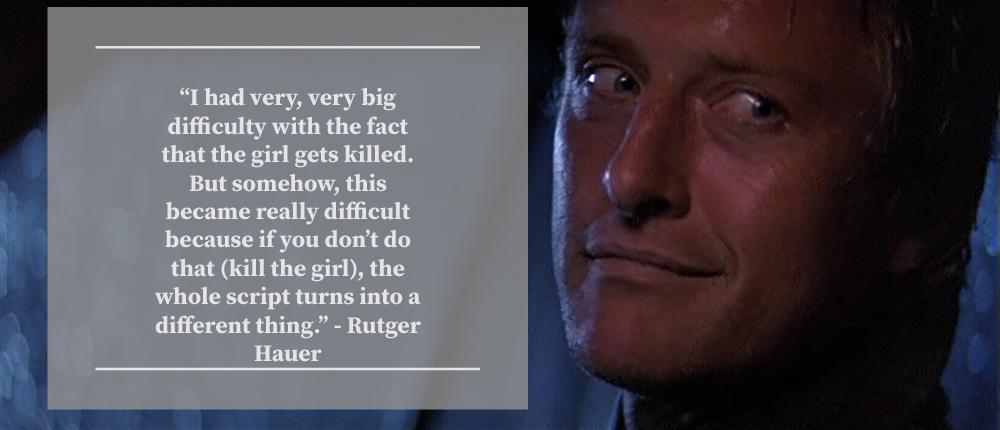 No one was thinking of such things in those terms back in 1986. Even then, however, they knew Nash’s death was going to be the scene everyone talked about. As Ed Feldman, one of the film’s producers, told The LA Times, “Rutger didn’t want to do it; he thought he’d be the bad guy. I told him, ‘You are the bad guy . . . and you’ll be the baddest bad guy there ever was!’”