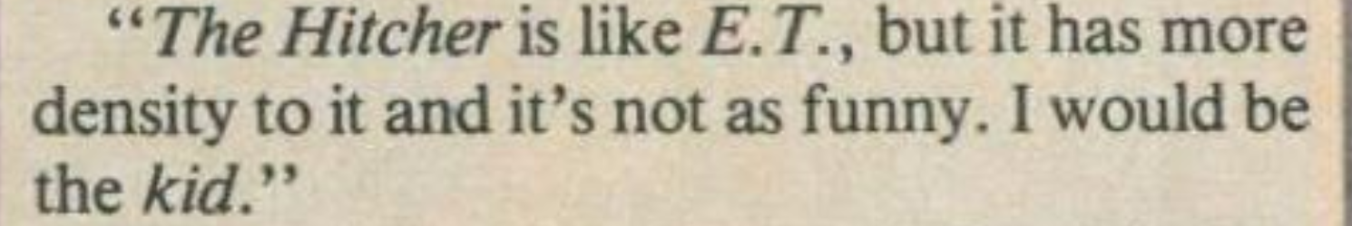 Interviewed by Starlog after the film’s release, Hauer praised Bob Harmon’s work as a first-time director and spoke of The Hitcher as hopefully his last hurrah playing the bad guy. (It stuck for a while, at least. He didn’t play another traditional heavy for another half-decade.) Hauer loved the way the film trusts the audience to divine the killer’s motivation, but as an actor, he had to come up with his own back story. The way he saw it: “[John Ryder] wants to get killed. He picks a specific guy to do the work. I guess he doesn’t have the guts to kill himself. He makes a point of that – ‘Look, I’m being killed’.”