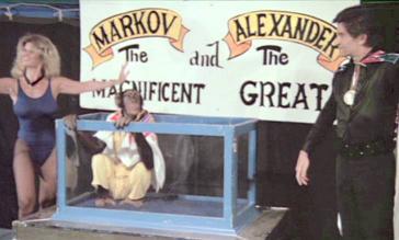 The film was – you learn in Blood & Flesh – a Hail Mary effort from Adamson to leave the exploitation circuit behind and transition into family film knockoffs, but being an Al Adamson production, everything was done on the cheap. The chimp they got had aged out of active use in an actual circus and was indeed quite frequently dangerous to be around, a bit odd since Alexander the Great is so often on screen in Carnival Magic opposite Regina Carrol, Adamson’s longtime wife. Beyond that, those who worked on Carnival Magic reveal the film’s big hook – Alexander can talk! – was added entirely in post. That was never a part of the story when they were working on the film. Adamson just improvised it.