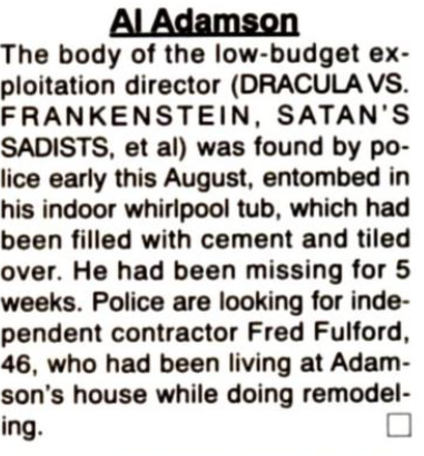 When Al Adamson died in 1995, Cinefantastique – arguably the premiere horror/fantasy/science-fiction magazine at the time – could only muster a 62-word obituary: