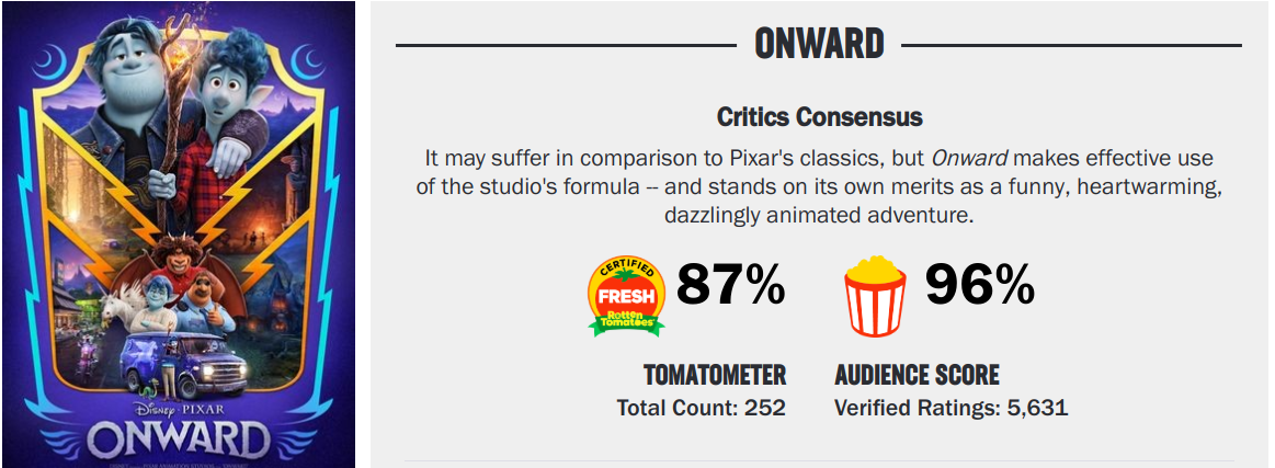 1. I have seen some joke that based on the first trailer, they would have assumed Onward was a Dreamworks movie if not for the Pixar logo – mostly because in premise and especially in literal appearance it just looked like a second-tier family film. I’d say that’s fair.