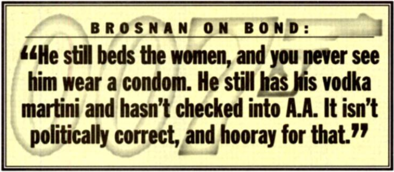 That was Pierce Brosnan’s cheeky reply when asked by a magazine writer on the set of GoldenEye how they planned to update Bond for the 90s. It’s not that he wasn’t worried about how to do a Bond movie in a post-Cold War world nor was he completely blind to the changing cultural whims of the time. Quite the contrary. Bond, however, had to remain distinctly Bond, and if they could update him just enough for the PC 90s without resorting to radical reinvention audiences would probably go along with it. “I would love to be responsible for revving up the Bond engine internationally again. Bond is a homegrown British product, and it would be great if I could make him a worldbeater again,” Brosnan said.