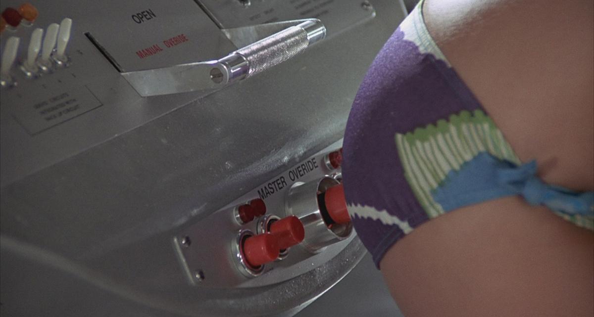 …Jill St. John – in her memorable bikini – pulls a similar act when she unknowingly undoes Bond’s little trick that would have caused the big bad’s space laser to malfunction. “You little twit” is his annoyed response. She later has a real Jamie Lee Curtis in True Lies moment: