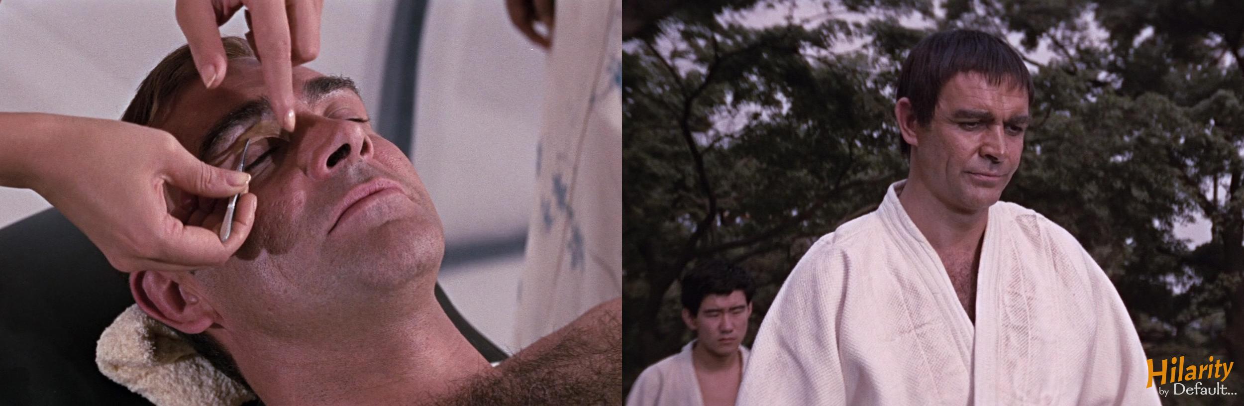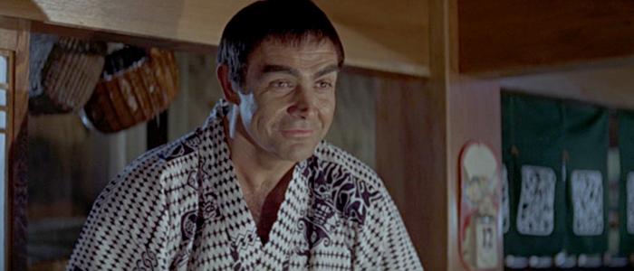 What trips me up here isn’t really the “what were they thinking?” sight of Sean Connery in wig, eyebrow extenders, and kimono. 1967 was a long ass time ago. It wasn’t cool then, certainly isn’t now, but it is what it is. I’m actually more thrown by the way this part of the film seems to lose the plot.