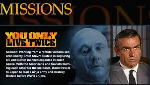 Ian Fleming Connection: Published in 1964, You Only Live Twice opens with a haiku which, in part, reads “you only live twice, once when you are born, and once when you look death in the face.” (Chilling since Fleming died, at the age of 56, the year the book was released.) The story sees Bond, still mourning the death of his wife in the OHMSS novel, sent to Japan to secure secret Japanese-American communications. There, he meets a sinister foreigner who turns out to be Blofeld in disguise. To beat the rat bastard, Bond dons a disguise as well, going undercover in a small fishing village where he befriends a failed Hollywood actress named Kissy Suzuki. The story grows to include a suicide cult, toxic garden, volcanic explosion, a pet bird named after David Niven (!), amnesia, and baby daddy drama.