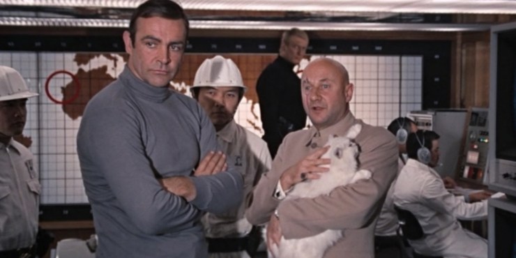 But, the Bond superfans will say, that same movie also has Donald Pleasance as Blofeld, a classic Nancy Sinatra song, a screenplay by Roald (Charlie and the Chocolate Factory) Dahl, stunning cinematography from the guy (F.A. Young) who shot Lawrence of Arabia, multiple scenes of a giant space rocket more or less swallowing another space rocket, Bond in something called a gyrocopter, people falling into a piranha pit, and one of the all-time great Ken Adam sets – an evil lair inside a volcano!